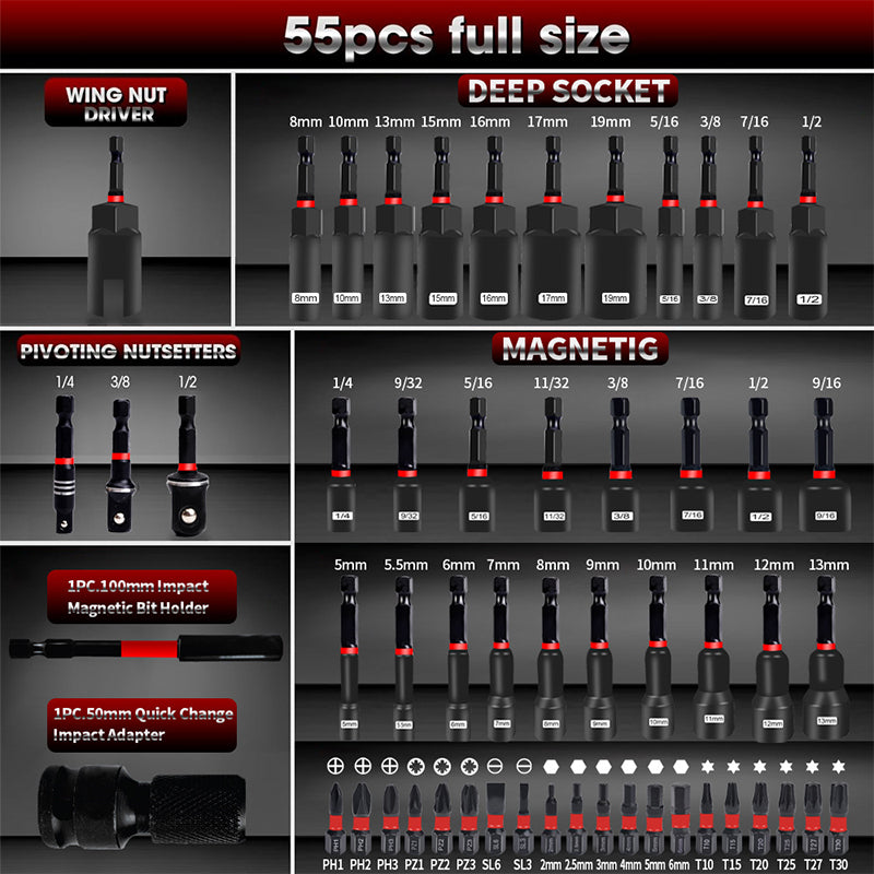 COMPREHENSIVE 55-PIECE SET - Includes a wide variety of nut drivers and bits to handle almost any fastening job, making it perfect for DIY projects, automotive repairs, and professional construction tasks.