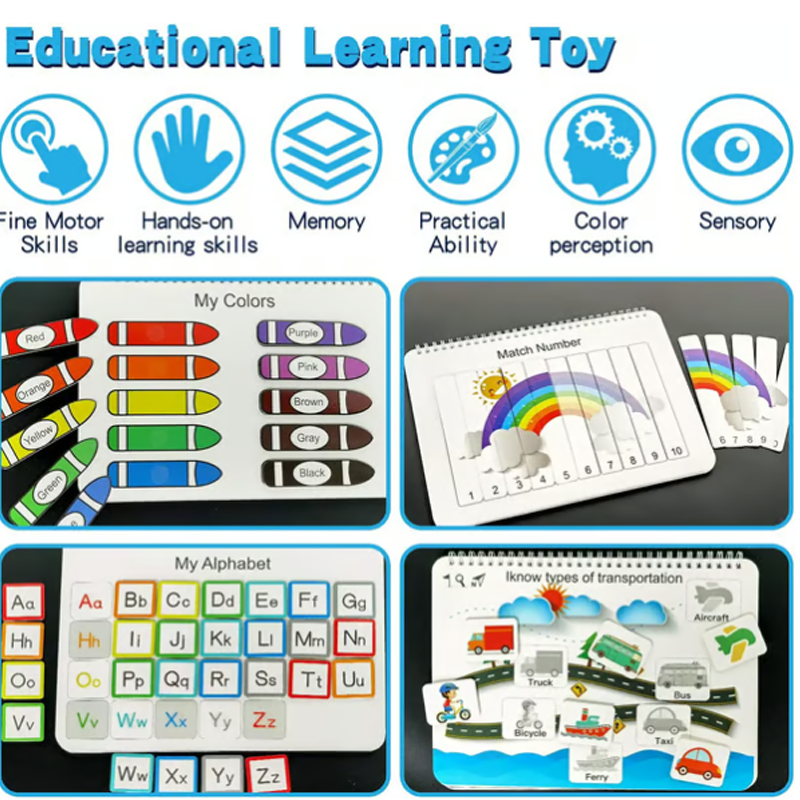 SKILL DEVELOPMENT AND HANDS-ON PRACTICE - This busy book strengthens fine motor skills, hand-eye coordination, and practical problem-solving. Interactive matching and sorting exercises enhance memory, color recognition, and sensory processing. Each activity challenges young learners just enough to foster steady growth, promote focus, and support self-confidence in a fun and engaging way.