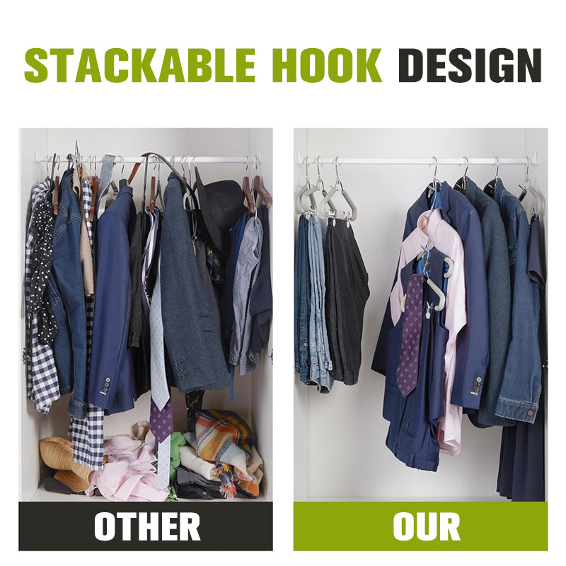 STACKABLE HOOK DESIGN – The innovative hook allows you to stack multiple hangers, maximizing your closet space while keeping garments organized and easily accessible. Perfect for small spaces.
